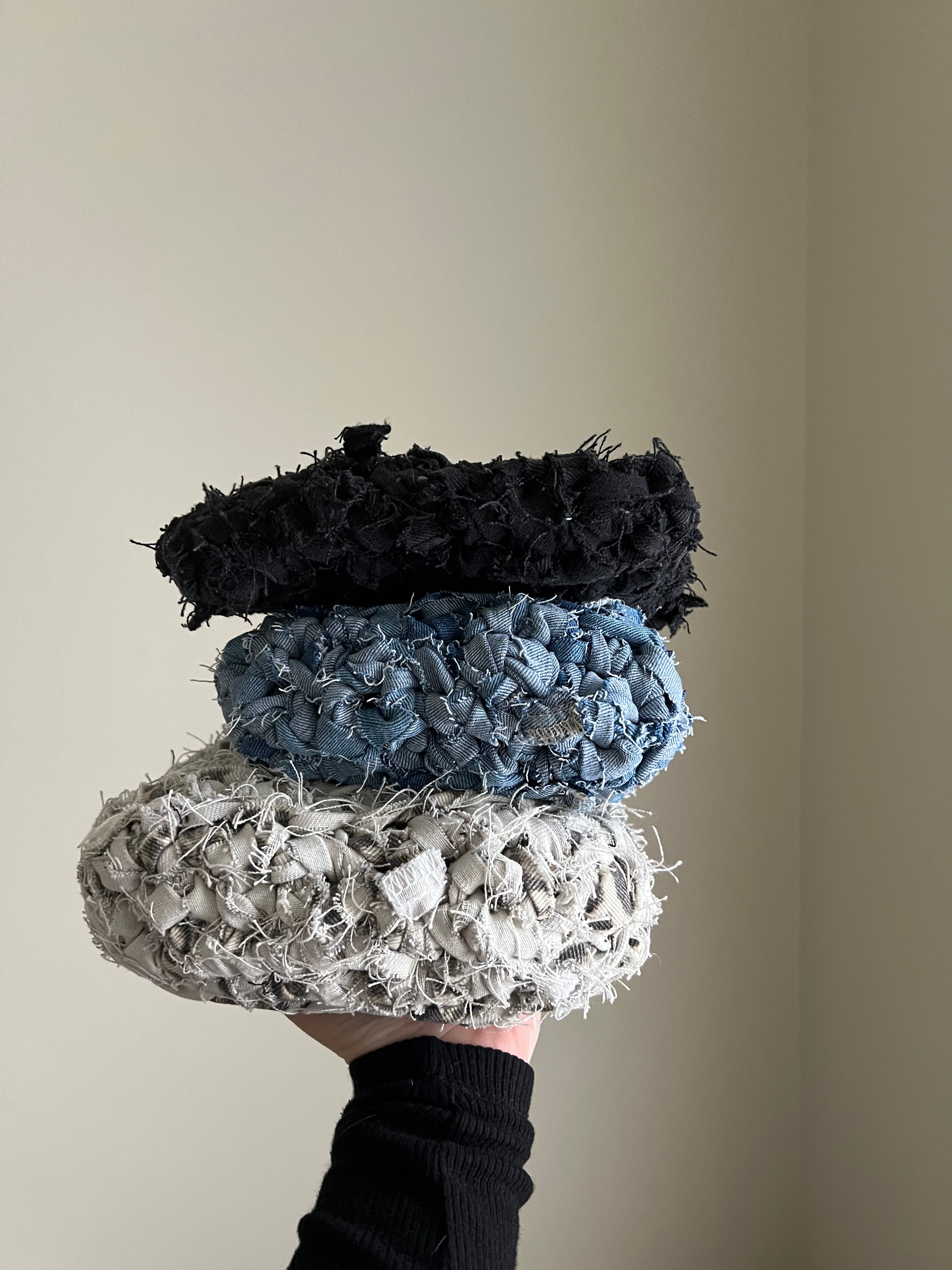 100% reclaimed fabric yarn. Thrifed clothing, fabric and accessories. Unused clothes. Deadstock/Surplus.